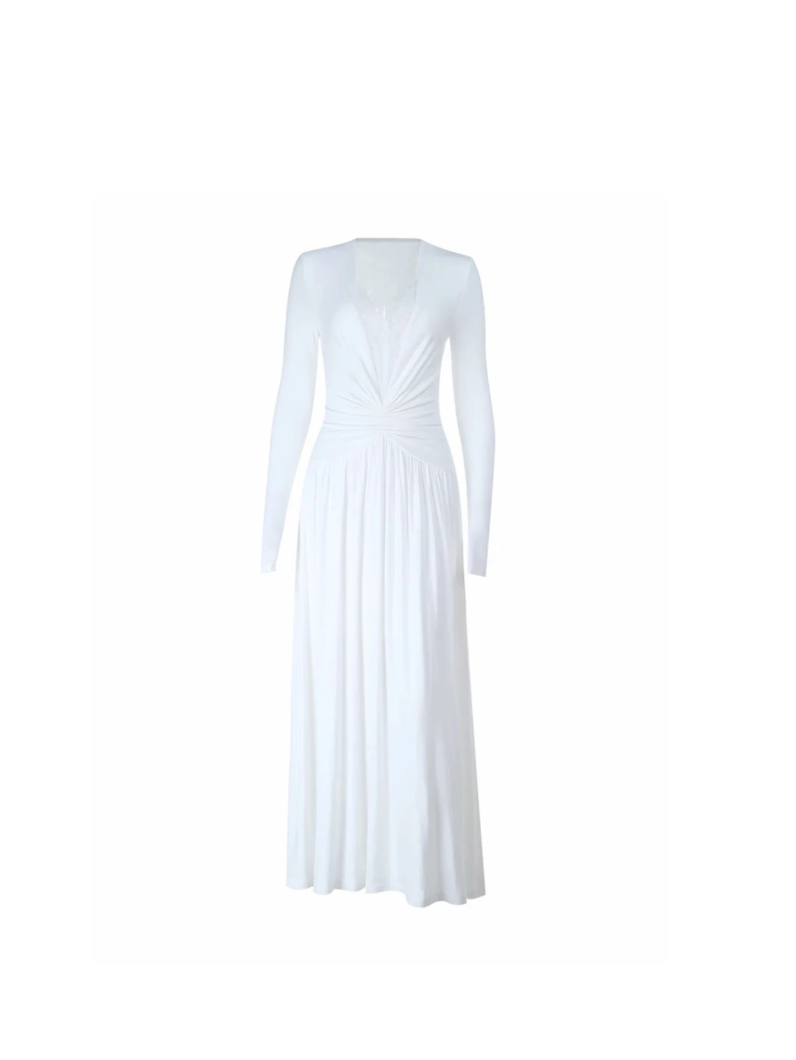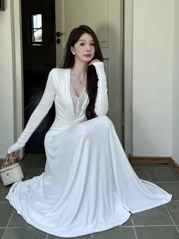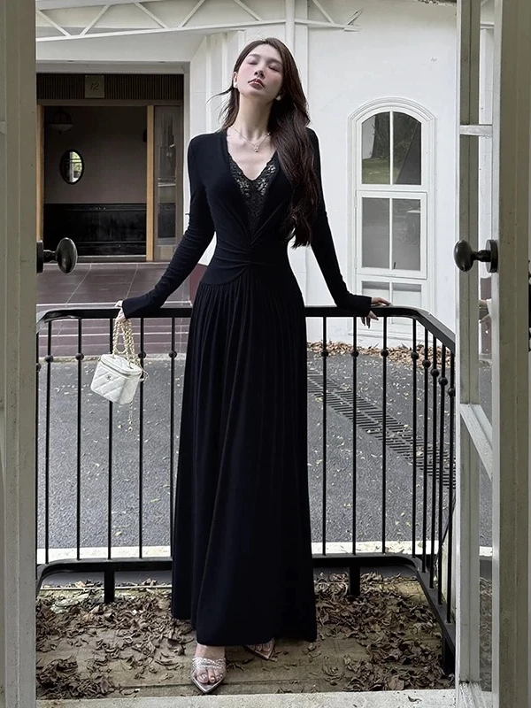 2026 French High-end Elegant Evening Gown Women's Long Sleeves V-neck Lace Patchwork Slim Long Dress Designed Minimalist Gown