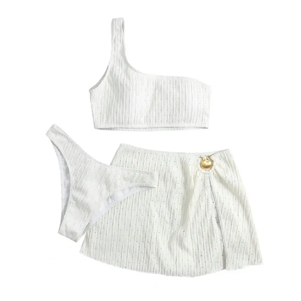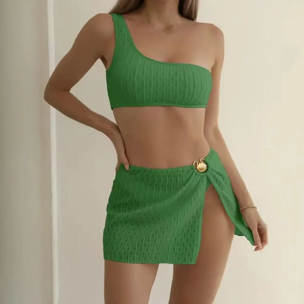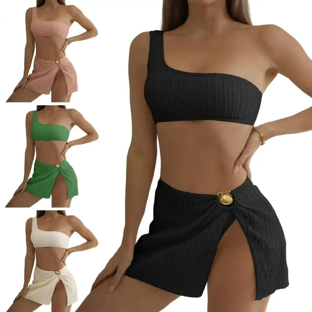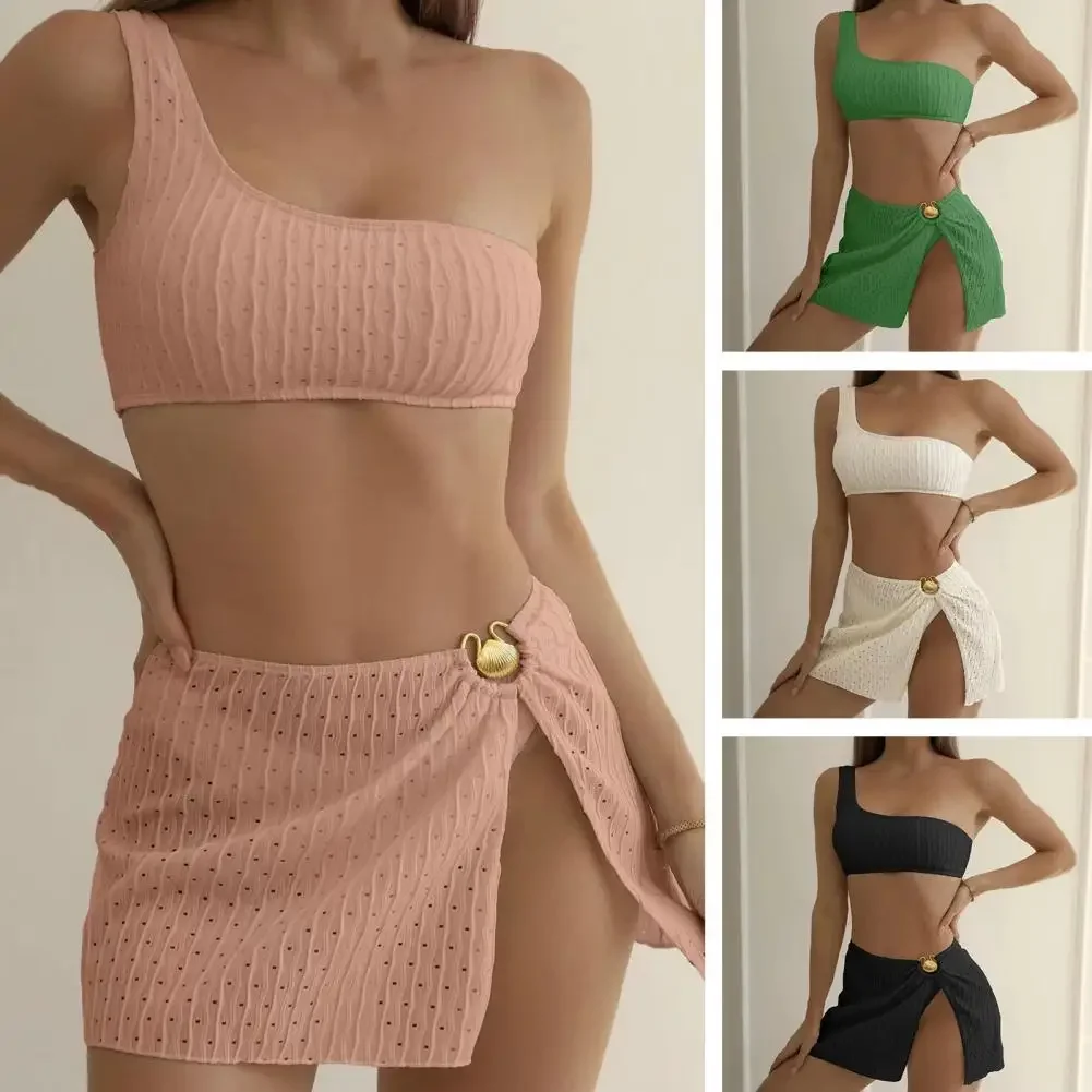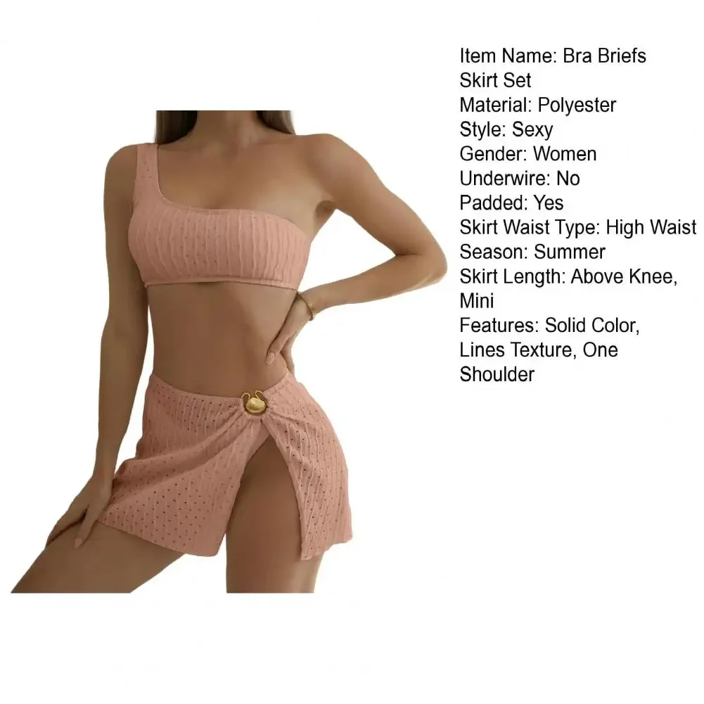 3Pcs/Set Summer Women Bikini Set Backless Lines Texture Bikini Skirt Set One Shoulder High Waist Metal Ring Lady Swimsuit