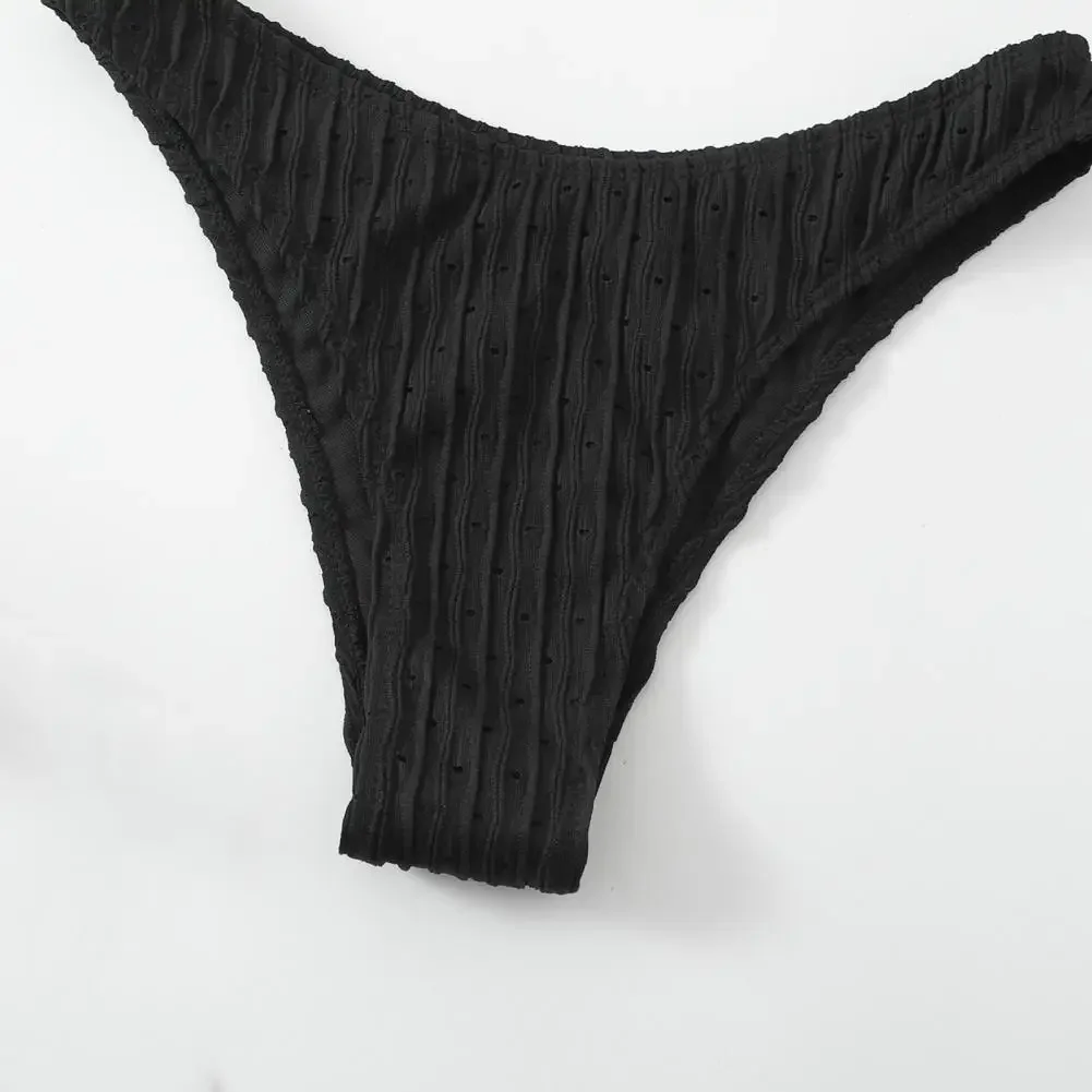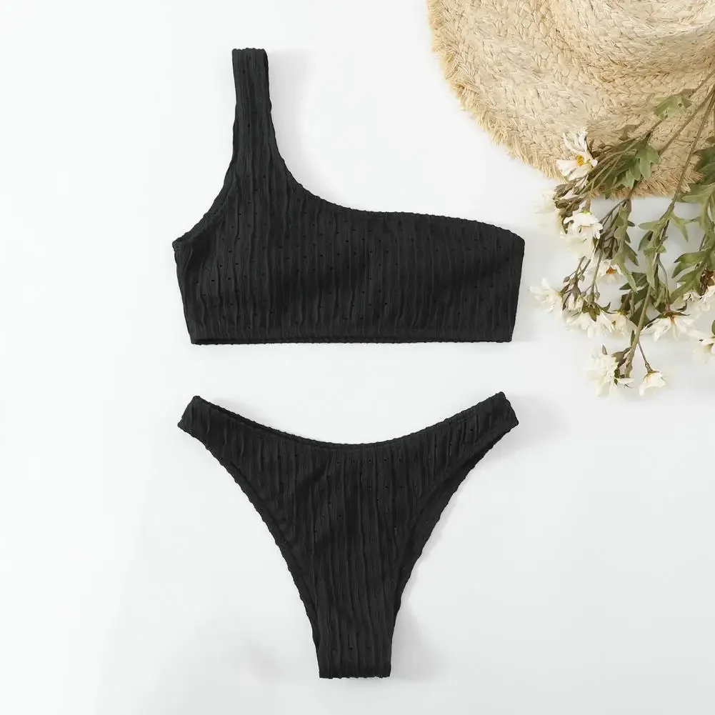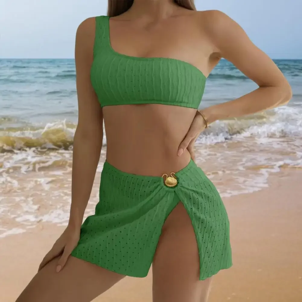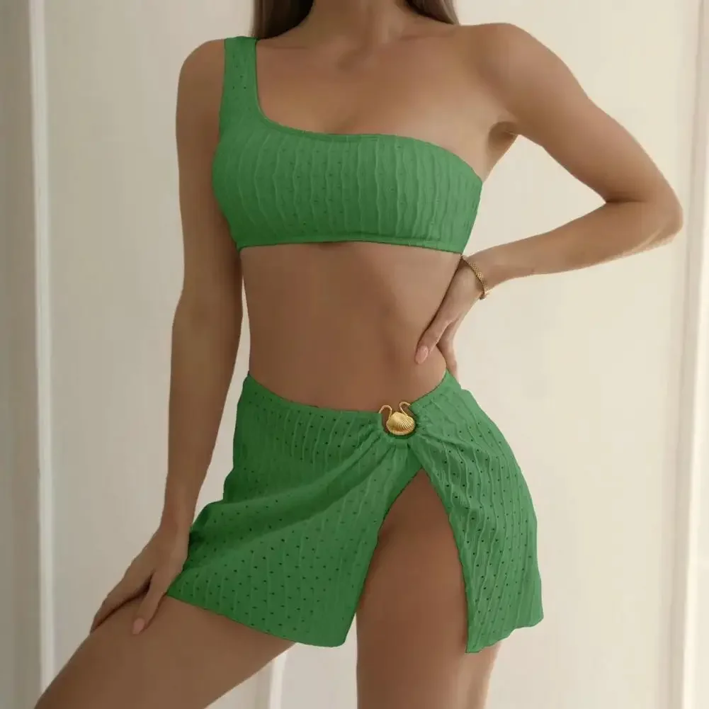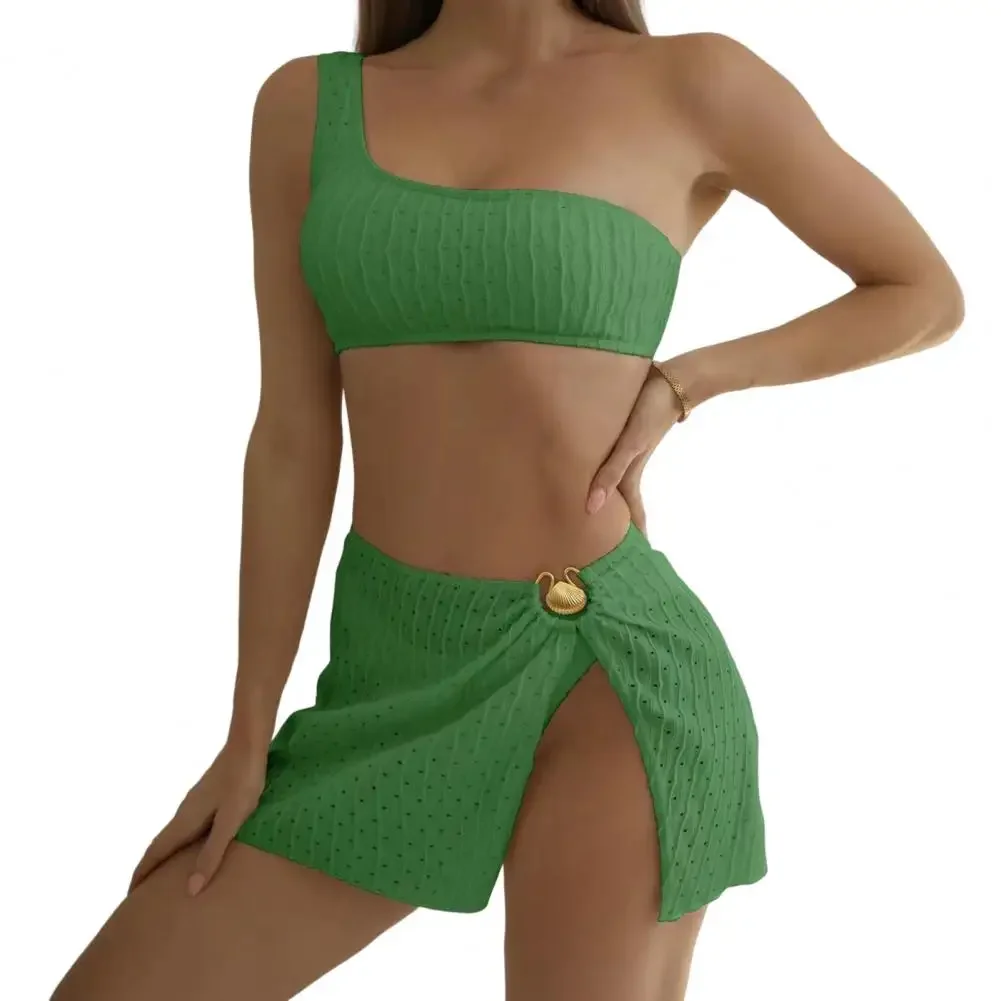 3Pcs/Set Summer Women Bikini Set Backless Lines Texture Bikini Skirt Set One Shoulder High Waist Metal Ring Lady Swimsuit