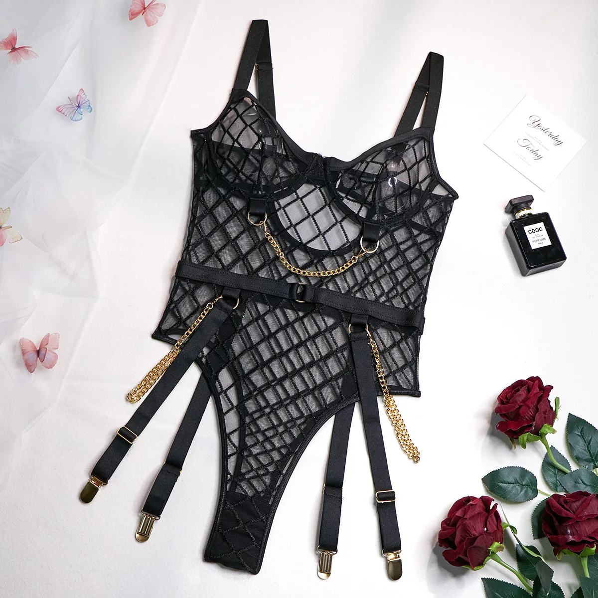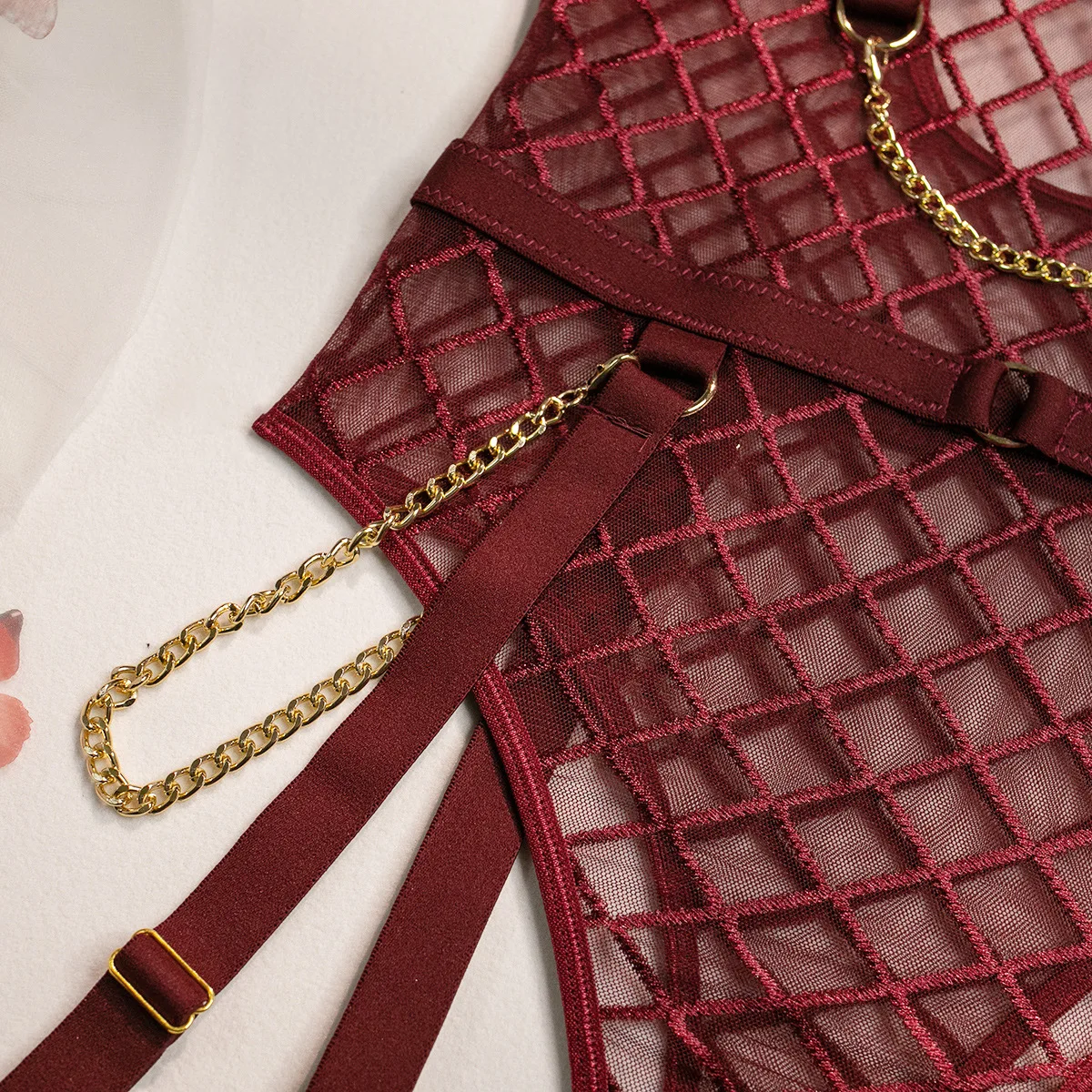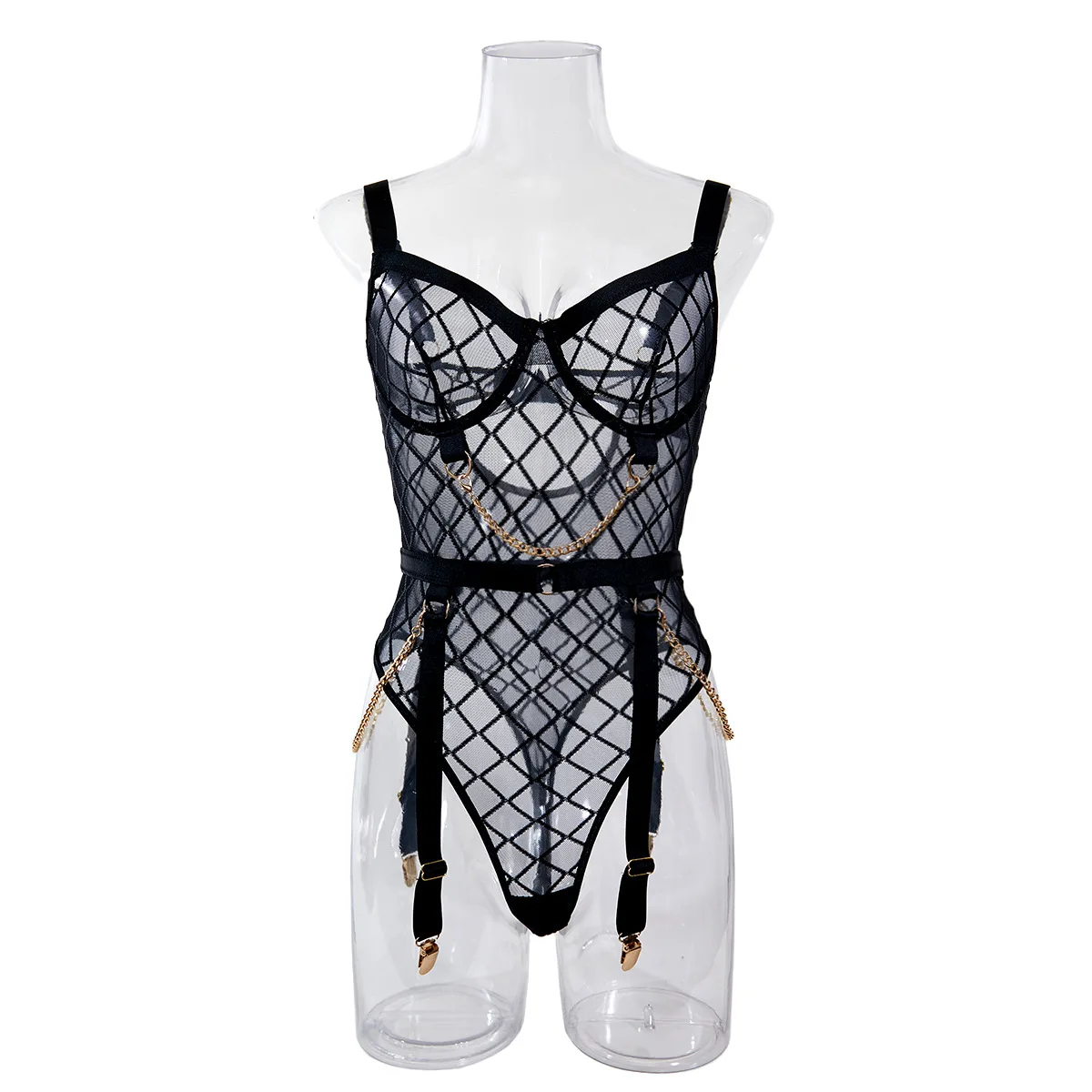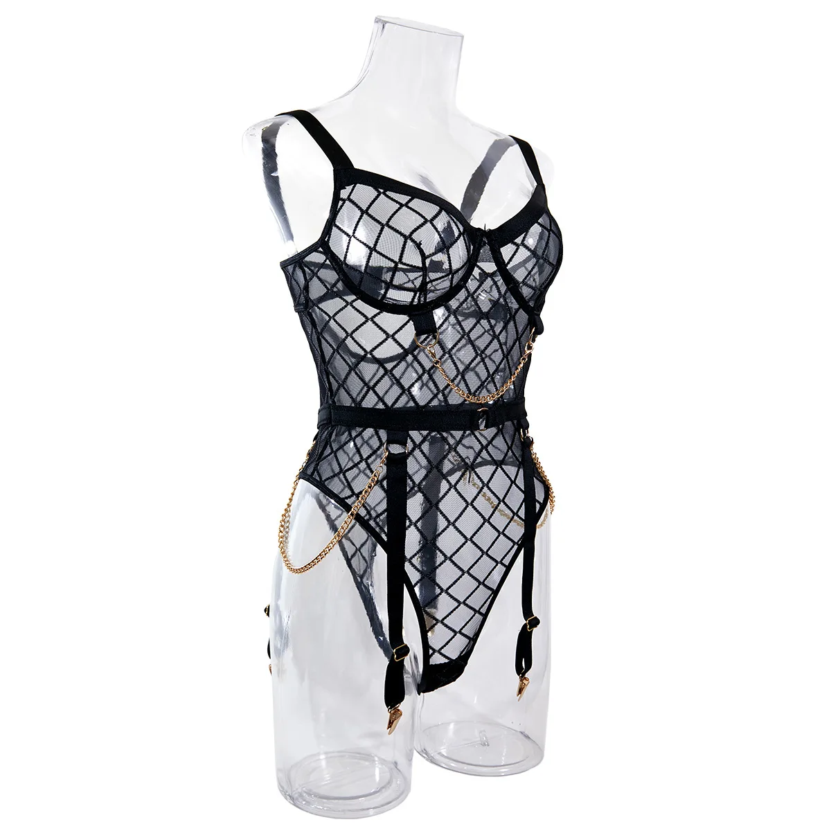Bikini Sexy Lingerie Large Mesh Metal Steel Ring Gather Comfortably Slim Fit Jumpsuit for Women